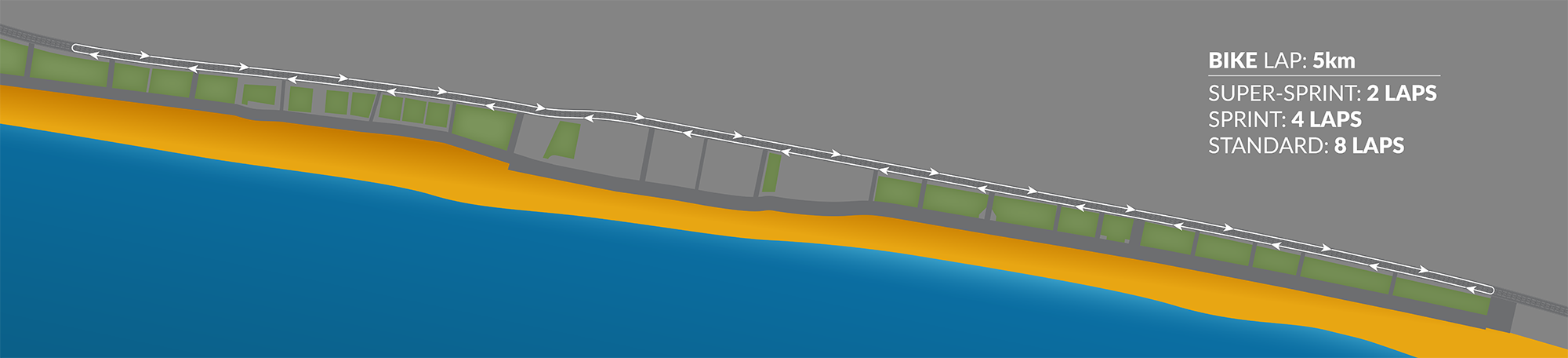 You will leave the beach and cross the prom directly into the transition area. Depending on your race distance you will run along the southern edge of the transition area until you reach your section within transition. Turn right and then left into your row where your bike is racked. Place your wetsuit and all other swim kit in your box. Failing to place all kit completely in your box will result in a time penalty. You must put your helmet on and ensure it is done up before taking your bike. Only after your helmet is securely in place should you then take your bike and push it out of the transition area to the mount point on the road. Having taken your bike continue in the same direction along your row and then turn right to the northern edge of the transition area where you will then turn left to head west to the bike exit. Do not mount your bike until you have crossed the mount line.