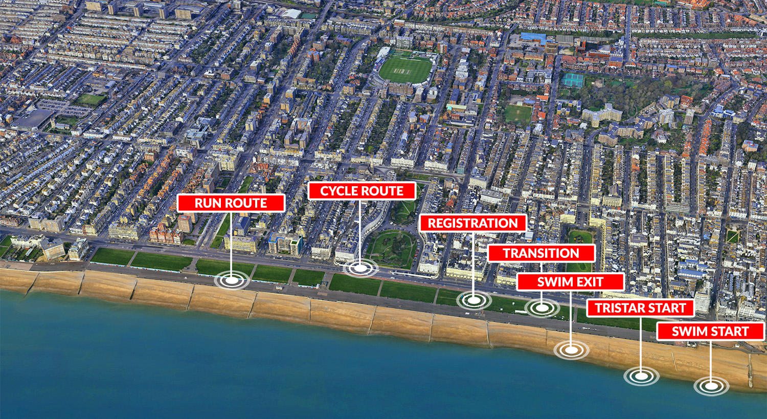 If arriving after 7:30am on Sunday, please avoid crossing the bike course (the A259 Kingsway) and cross beyond the turn point at Western Street (near the 'Peace Statue').