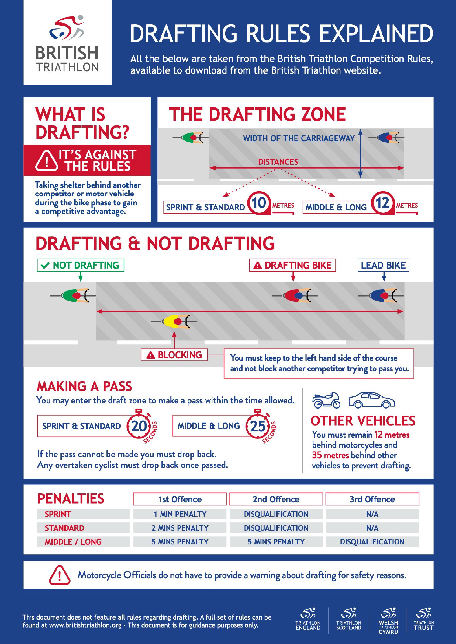 Drafting (taking shelter behind or beside another competitor) during the cycling leg of the race, is not allowed. The cycle draft zone will be 10 metres long measured from the leading edge of the front wheel. You may not enter the draft zone of another competitor except for the purpose of overtaking. When overtaking you must be seen to be progressing through that zone. A maximum of 20 seconds is allowed to pass through the draft zone of another competitor. If an overtaking manoeuvre is not completed within 20 seconds the overtaking cyclist must drop back. When a competitor is passed by other competitors, it is his/her responsibility to drop back to move out of the draft zone of the overtaking competitor. Failure to do so may result in an official caution or time penalty. A competitor is passed when another competitor’s front wheel is ahead of his/her front wheel. Motorcycle and static BTF referees will patrol the course to enforce the no drafting rule.