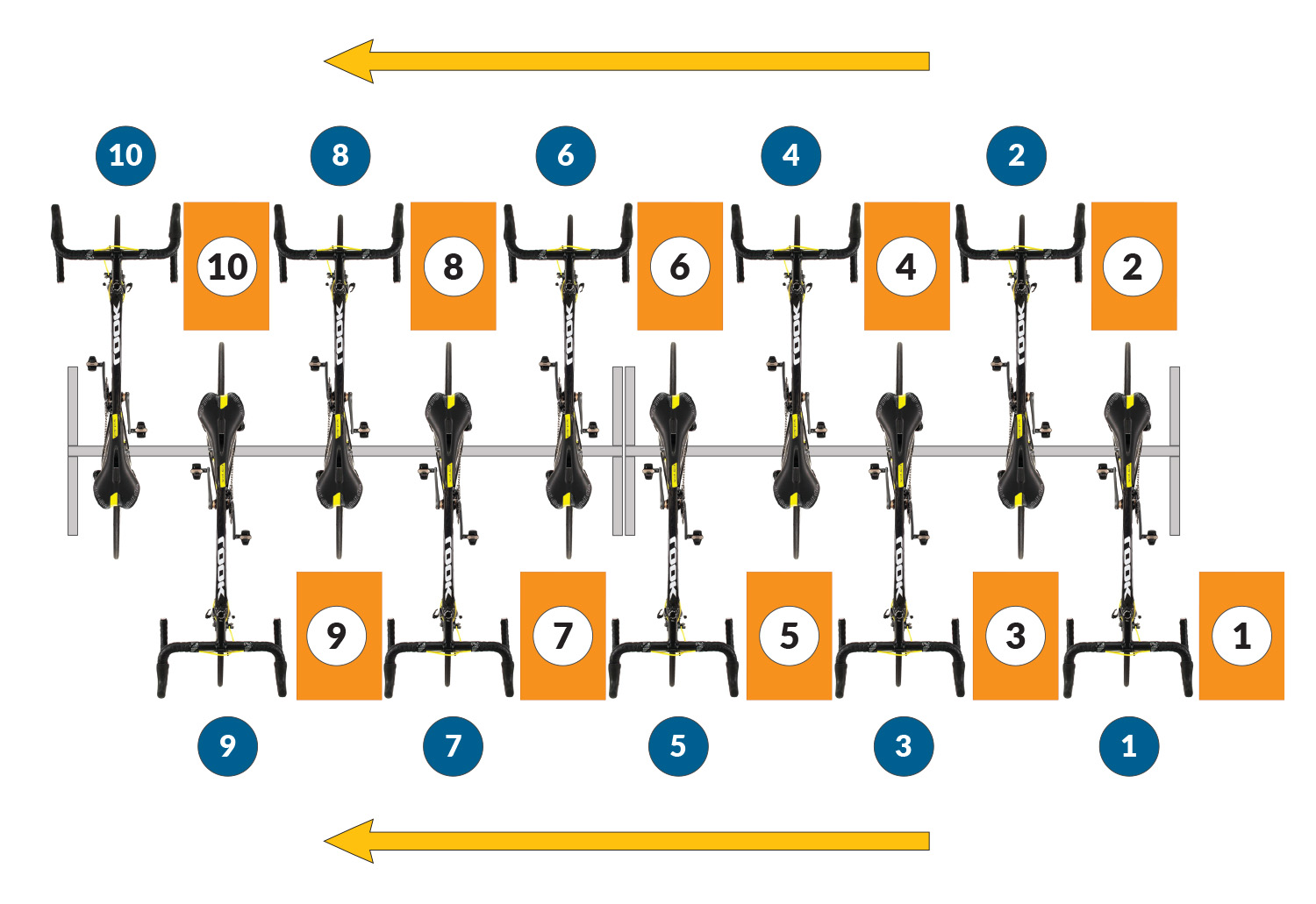 Racking is numbered with odd numbers on one side and even numbers on the other. For fairness, age-groups will be grouped together in transition.