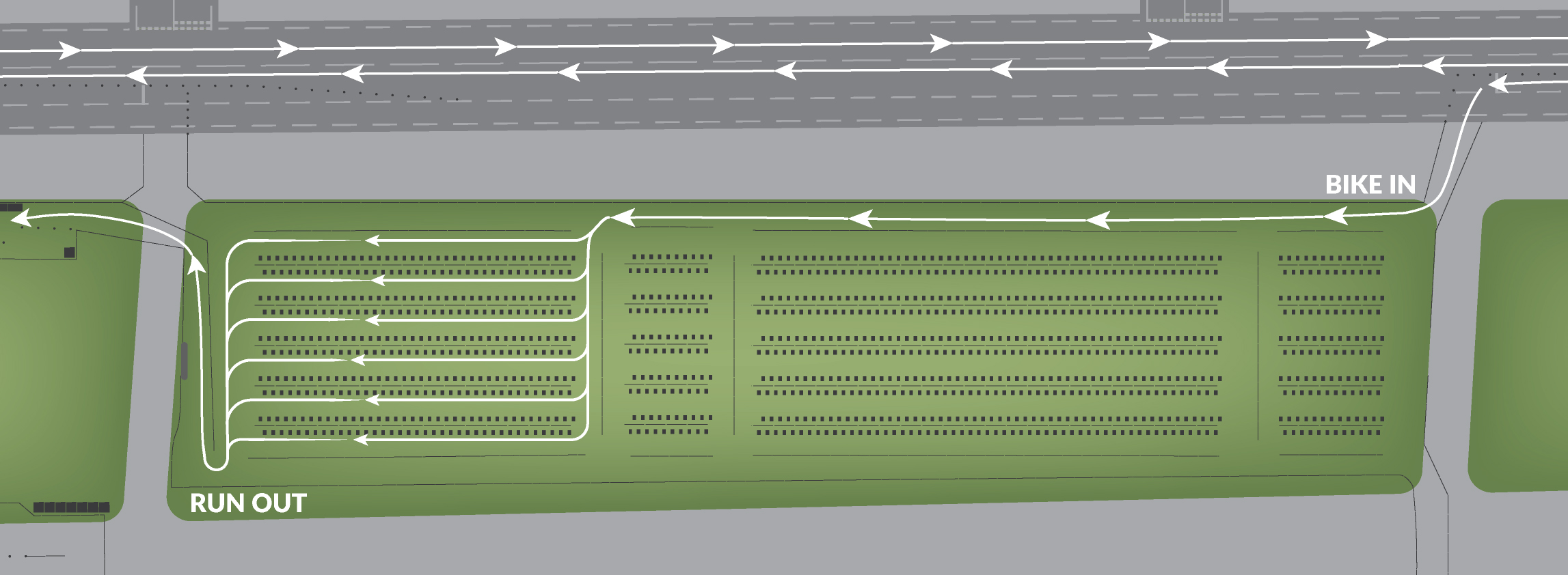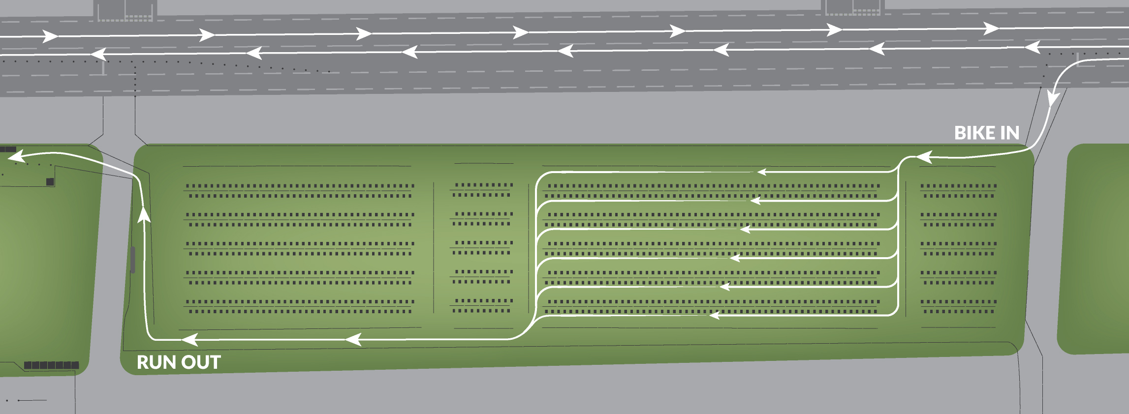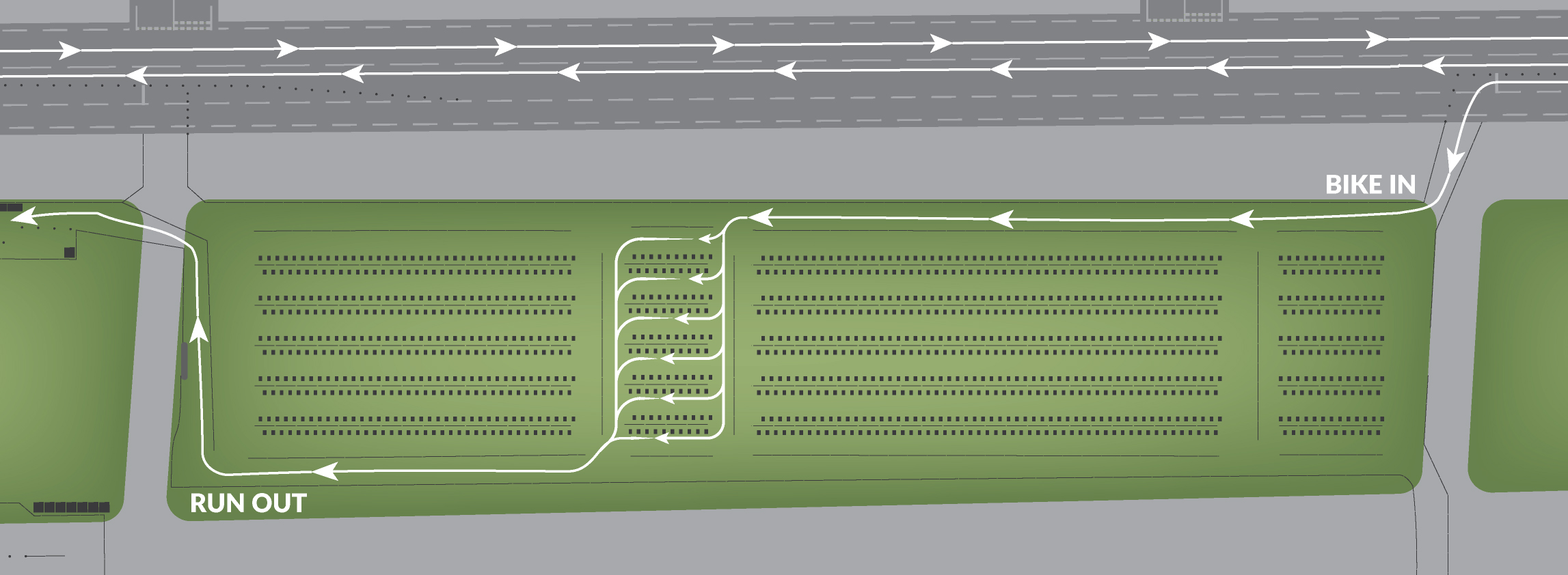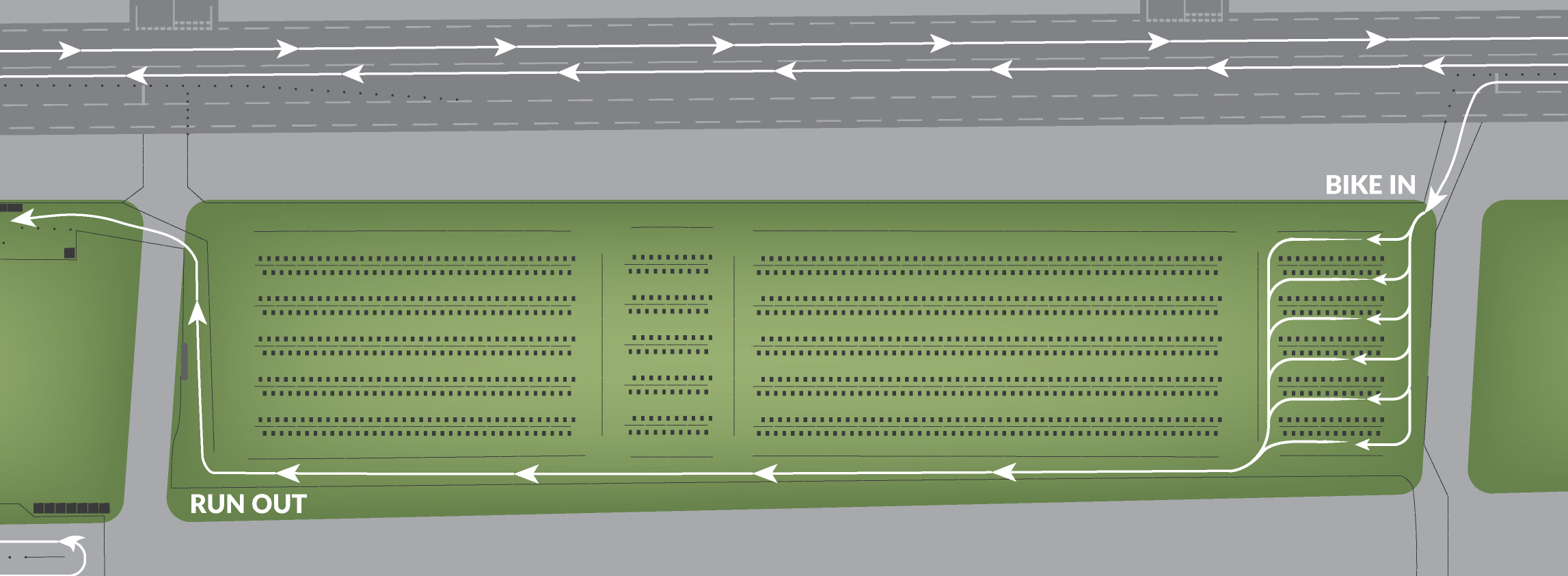 Having dismounted your bike before the dismount line, you will run with your bike into transition. Run along the north edge of the transition area until you reach your section within transition where you will turn left and then right into your row. Run to your position in the transition area and rack your bike. Only after your bike is racked can you remove your helmet. Do not unclip your helmet until your bike is racked, doing so will result in a penalty. Remove your helmet and put on your run shoes. Make sure your helmet and any other kit is placed in your box (failing to place all kit in your box will result in a time penalty). You will then continue to run along your row in the same direction. At the end of your row turn left to the southern edge of the transition area and then turn right to the 'run out' exit.