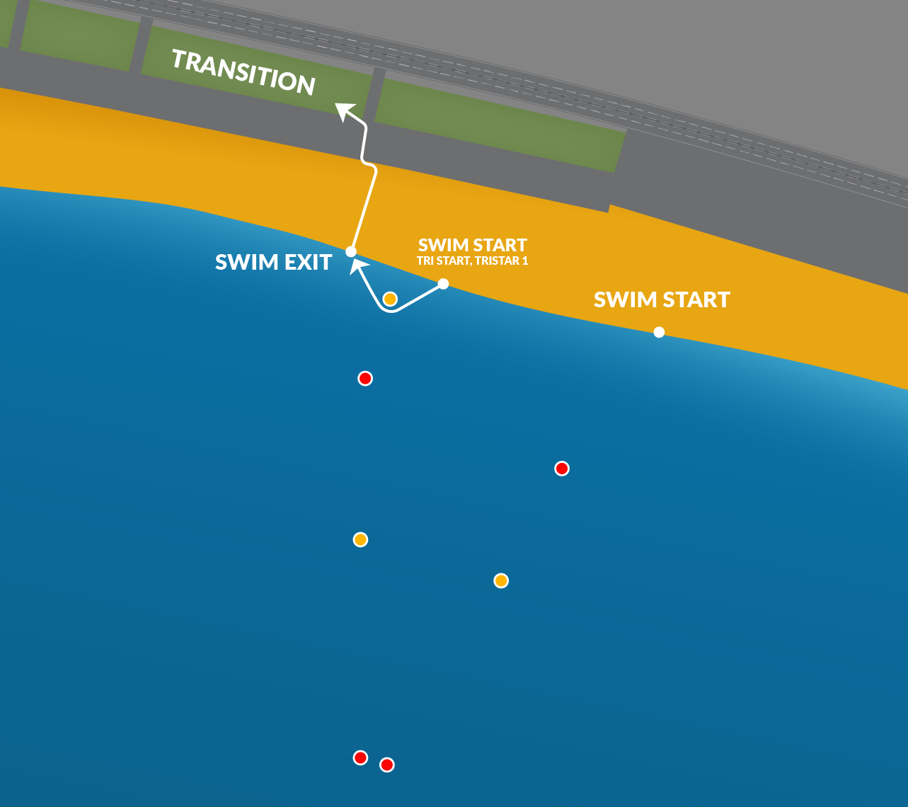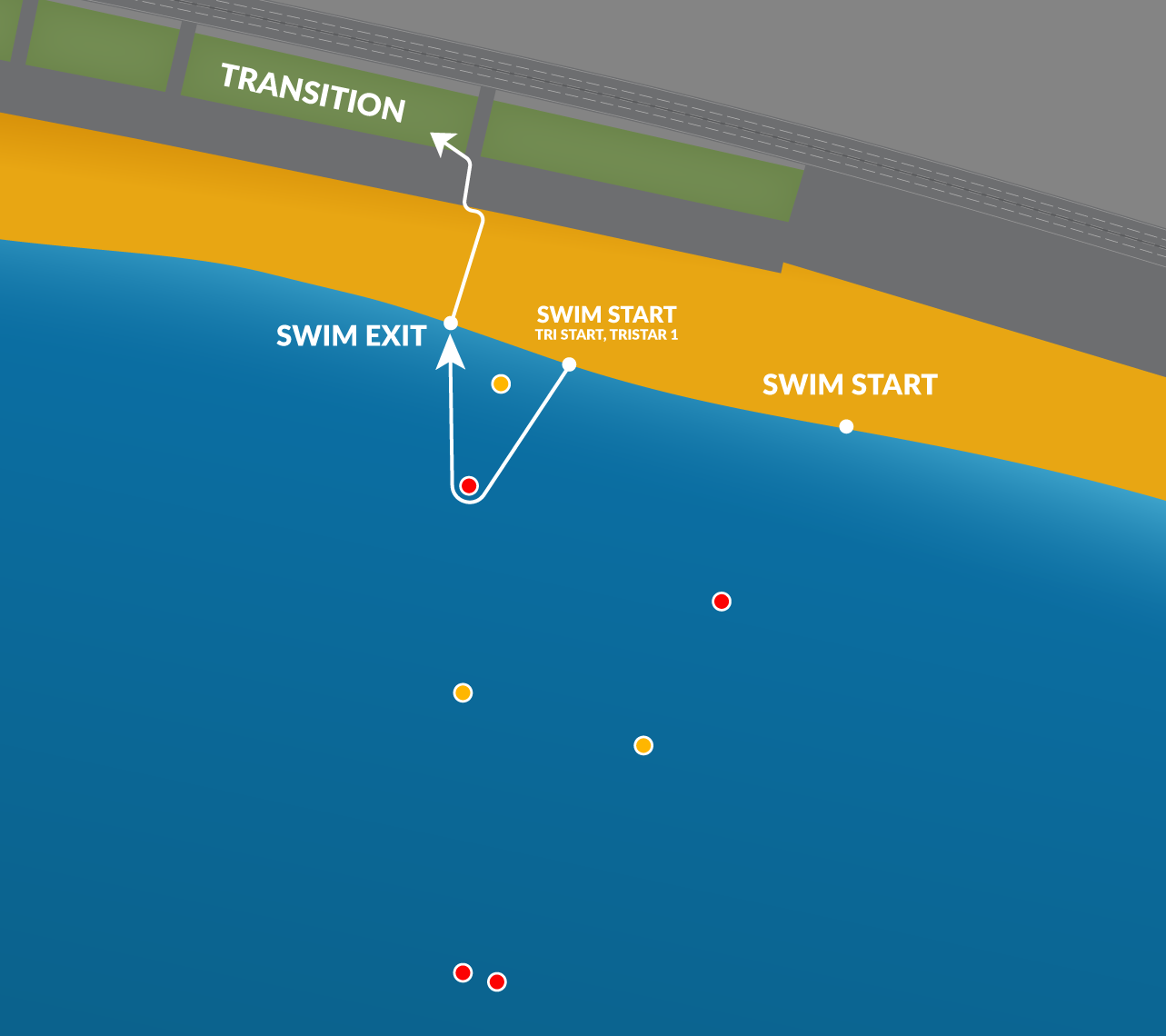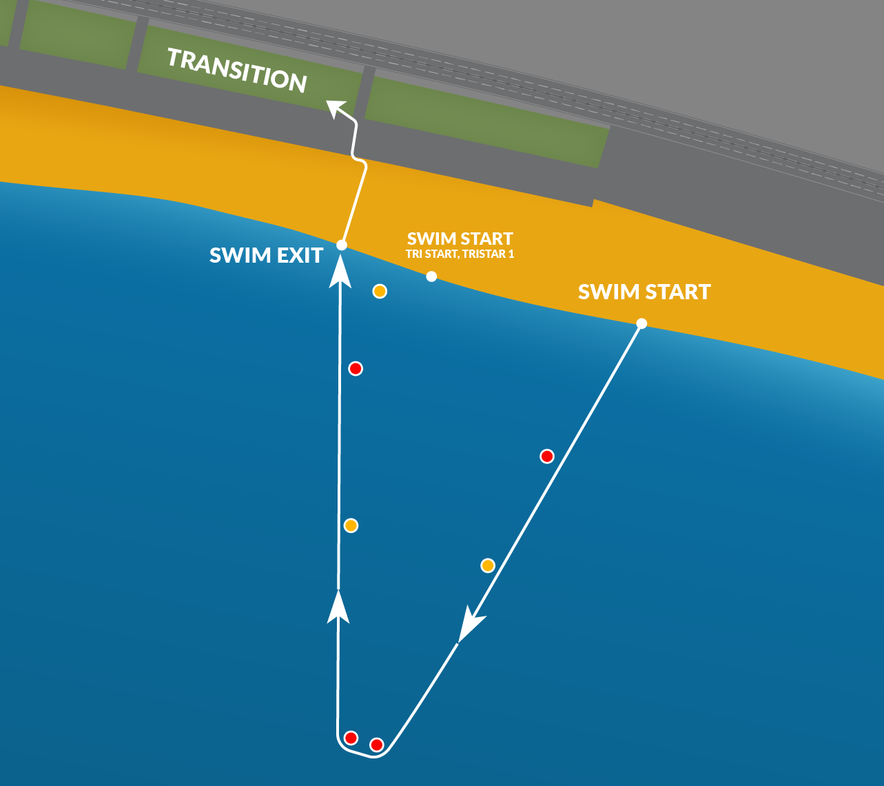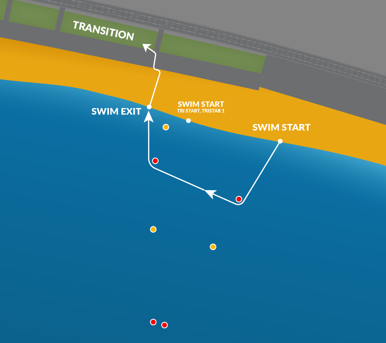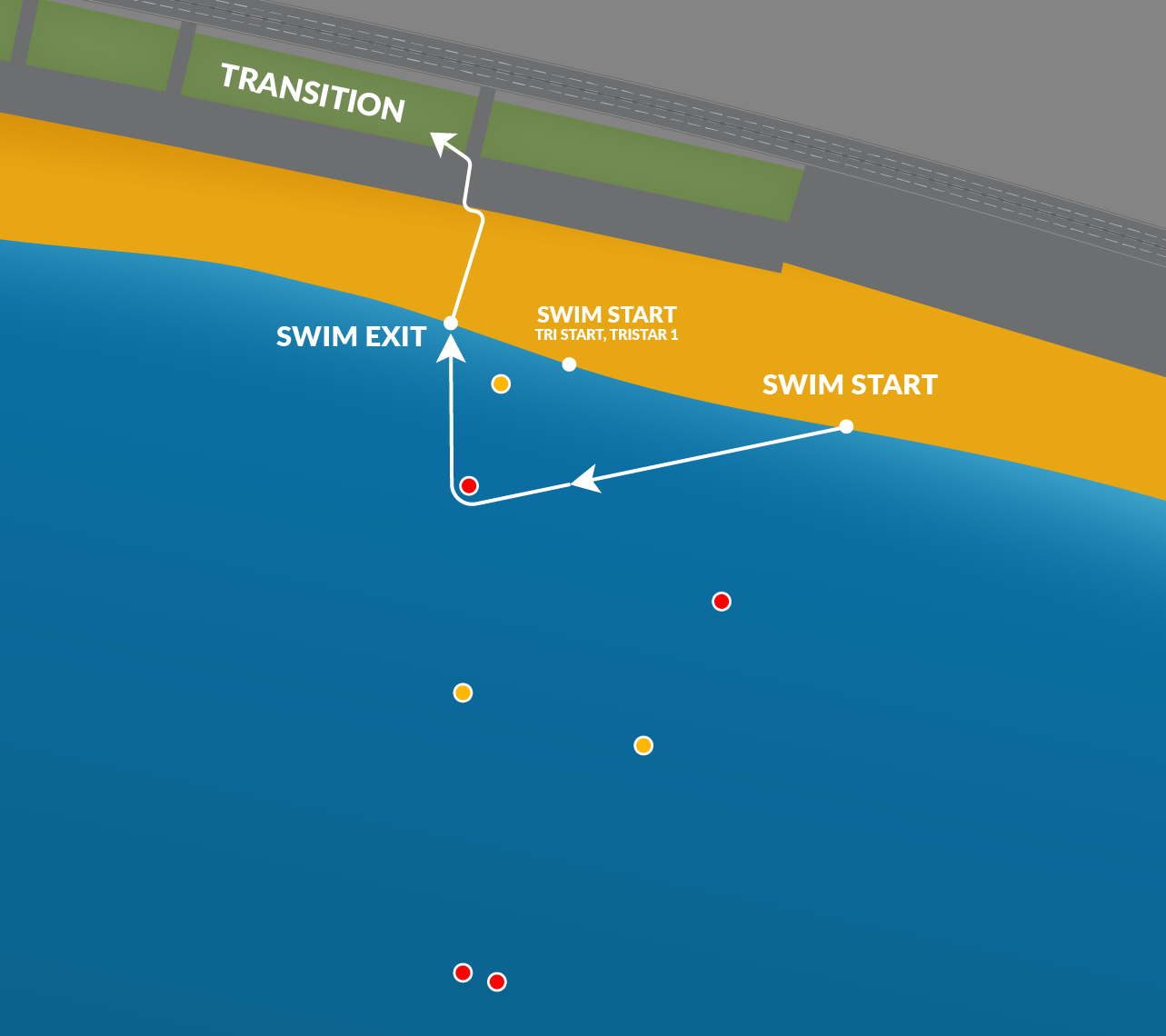 The TriStar 1 race will start approximately 50m to the east of the swim exit. You will swim 100m out to the nearest red buoy (passing the yellow TriStart buoy at 50m) and make a right turn (keeping the red buoy on your right) and then swim 100m back to the swim exit.