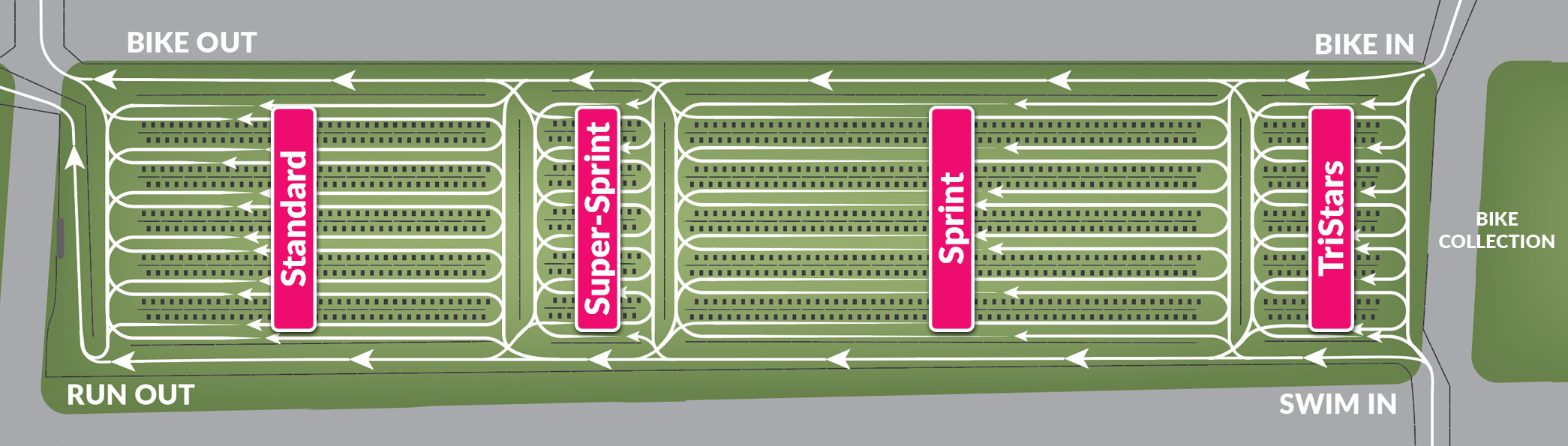 Bike collection will be from the eastern end of the transition area (furthest from the finish line). The number on your wrist band will be checked against the number on your bike sticker.